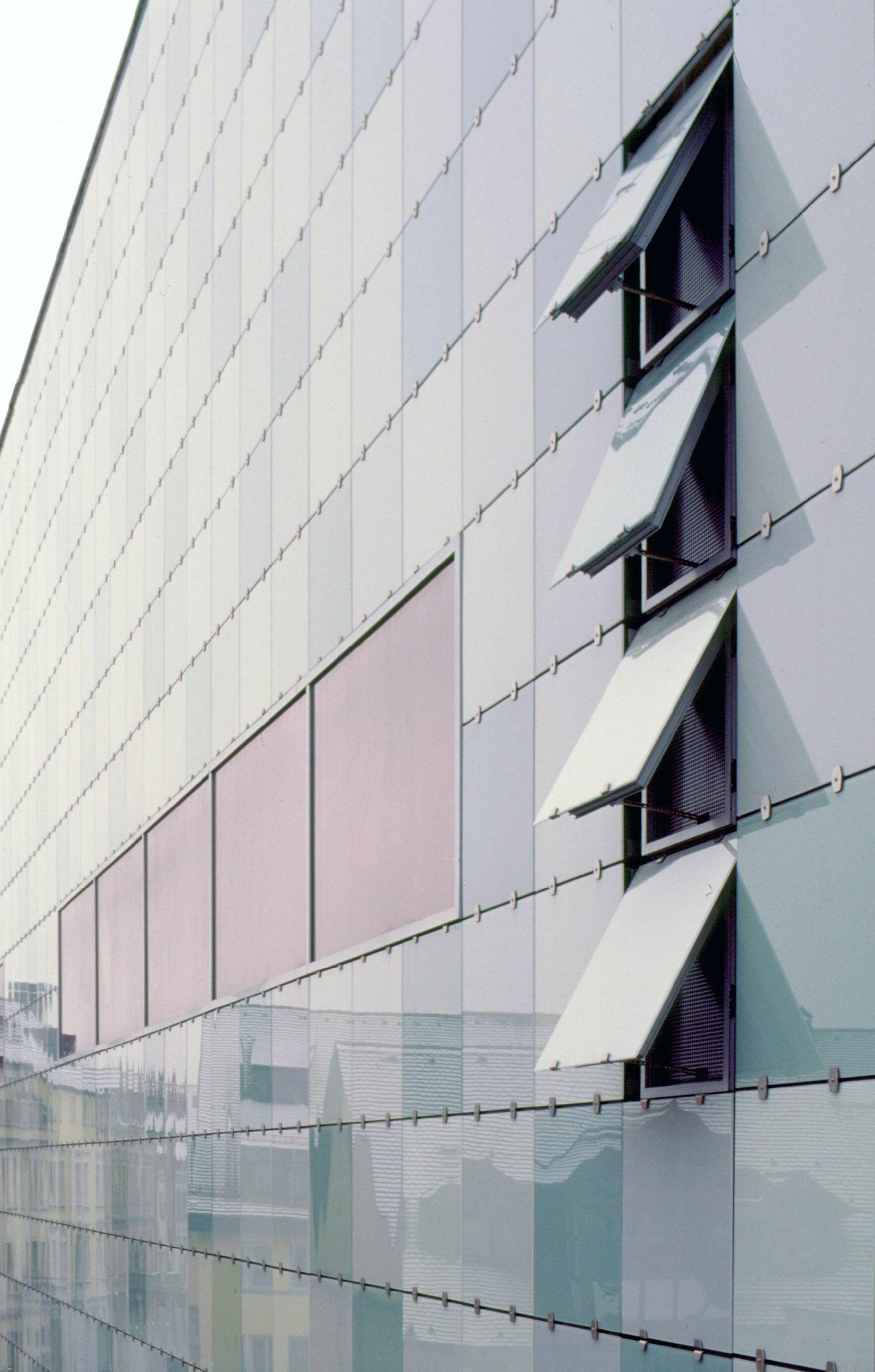 Das Projekt "Umbau des Karstadt-Warenhauses in Konstanz" war geprägt von zwei wichtigen Aufgabenstellungen: zum einen sollte das Erscheinungsbild im Stadtraum über die Neugestaltung der Fassade verändert werden und zum anderen der Energieverbrauch (besonders die Kühllast) deutlich verringert werden. Beide Anforderungen erfüllen sich in der Realisierung einer speziell entwickelten Fassade, einer technischen als auch wahrnehmerischen Schnittstelle zur Umwelt. Die beweglichen Elemente fügen sich in das Patchwork der identitätsstiftenden Hülle und transportieren bildhaft die Idee vom Gebäude als lebendiger Organismus. Eigens entwickelte Fassadenhalterungen komplettieren den CI-Gedanken vom variablen, jedoch eigenständigen Erscheinungsbild, übertragbar auch auf andere Warenhäuser.